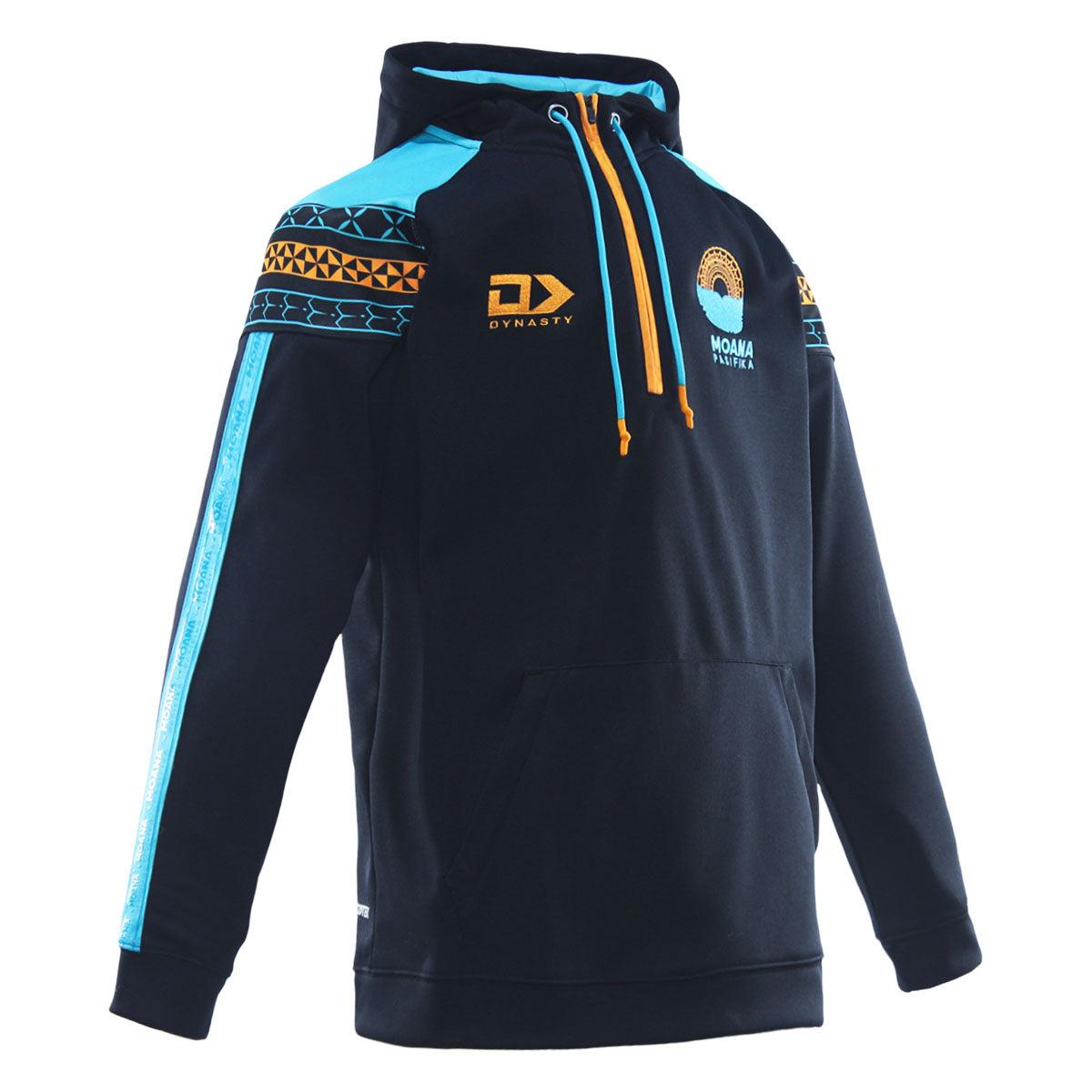 Designed for training and travel, this black 1/4 zip hoodie features teal panel detailing and shoulder taping for a strong athletic look. Includes a kangaroo pocket, adjustable hood with toggles, and screenprinted wordmark for a bold team finish.