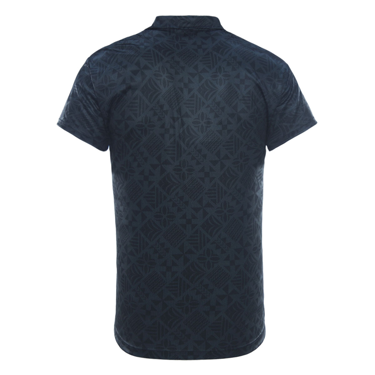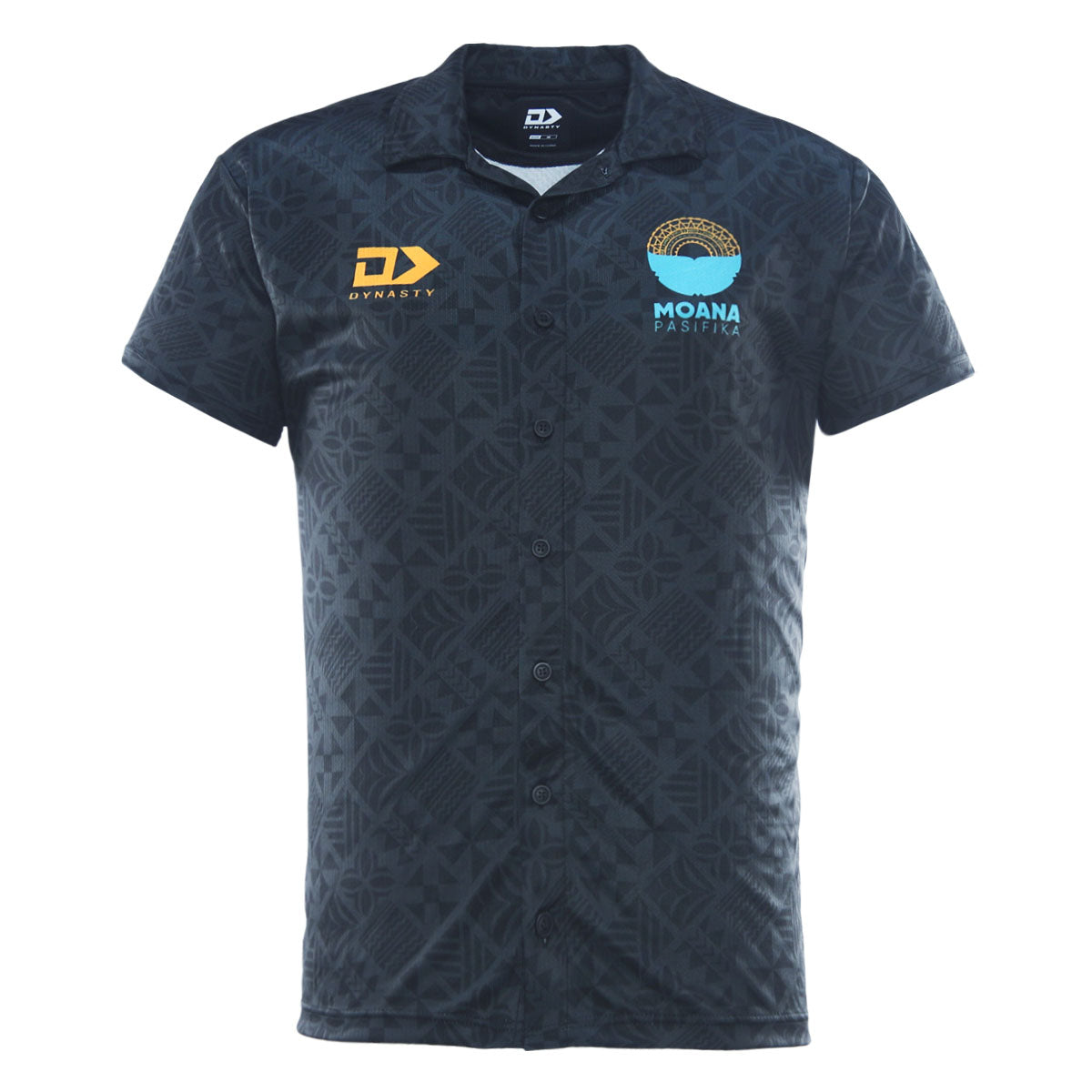 Charcoal button-up covered in subtle Pasifika patterning, designed to look polished while still carrying team identity. Full button front with sublimated logos for a streamlined off-field statement.